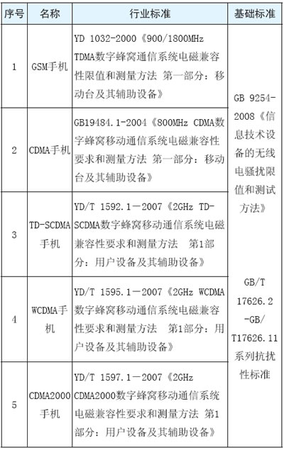不同制式的手機電磁兼容測試時,選擇不同的行業(yè)標準,依據(jù)的基礎標準相同,見下表1。