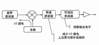 為了解決信號(hào)發(fā)生器的需求,一個(gè)上變頻器將信號(hào)從1.1GHz~2.2GHz頻帶變換至4.9GHz~6GHz頻帶。表2列出了上變頻器的兩種技術(shù)。同樣,我們選擇基本混頻方案。上變頻器的方框圖基本上和下變頻器類似,只是作些變更以適應(yīng)輸入頻率低于輸出頻率(圖2)。同樣可以用2dB衰減器來改善混頻器每個(gè)端口的匹配度。用相同的混頻器和開關(guān)來提供變頻或直通性能。上邊帶由輸出級(jí)的帶通濾波器除去,最終的輸出電平用可程控衰減器進(jìn)行高速調(diào)整,為了便于觀察,針對(duì)頻譜倒置的校正是必不可少的。