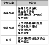 表1列舉了3種主要的下變頻技術(shù),同時(shí)指出了各自優(yōu)缺點(diǎn)?;净祛l似乎是最佳方案。在4.6GHz~6GHz下變頻場(chǎng)合,使用固定頻率的本振,1.1GHz輸出信號(hào)的頻帶與輸入信號(hào)頻帶相同,因此稱為區(qū)變頻。