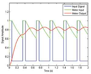 為幫助查看準(zhǔn)峰值檢波器與相關(guān)儀表組合的響應(yīng),圖2把輸入響應(yīng)(重復(fù)脈沖,用藍色表示)、得到的準(zhǔn)峰值檢波器響應(yīng)(具有響應(yīng)快、衰減慢的特點,用綠色表示)及檢波器與儀表的綜合響應(yīng)(用紅色表示)分開。