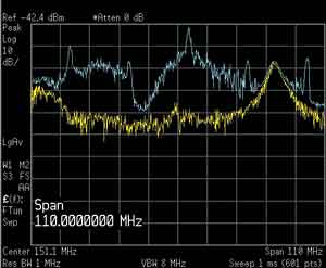幸運的是,測量技術(shù)的發(fā)展已經(jīng)可以滿足這些需求。上面介紹了如何使用實時頻譜分析儀發(fā)現(xiàn)瞬態(tài)信號和EMI隱患。在下面的實例中,單個的瞬態(tài)信號會產(chǎn)生一串瞬態(tài)信號,這些信號每次只持續(xù)很短的時間。在本例中,該設(shè)備是一種嵌入式系統(tǒng),在把數(shù)據(jù)緩存到硬盤時導(dǎo)致了瞬態(tài)EMI.在使用掃頻分析儀的峰值檢波器簡單檢查后(黃色軌跡,如圖6所示),似乎只有一個連續(xù)信號;把儀器保持Max-hold幾分鐘,同時循環(huán)DUT工作模式,會指明問題(藍色軌跡)。但在峰值檢波模式下進行快速掃描會得到黃色軌跡,沒有檢測到問題。
