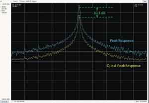 圖4是峰值檢波和QP檢波實例。這里,峰值檢波和QP檢波中查看了8μs脈寬和10ms重復(fù)率的信號。得到的QP值比峰值低10.1dB.在測量被測設(shè)備的EMI時,通常會先測量峰值,找到超過或接近規(guī)定極限的問題區(qū)域。然后只在接近或超過限制的信號上進行速度較慢的準(zhǔn)峰值測量。通常使用帶有標(biāo)準(zhǔn)峰值檢波器的頻譜分析儀,迅速評估任何問題區(qū)域。