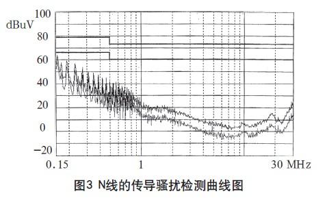 在3m法電波暗室對試驗樣機進(jìn)行測試,其L、N線的傳導(dǎo)騷擾檢測曲線如圖2、3所示,輻射騷擾的垂直極化掃描曲線如圖4、5所示。