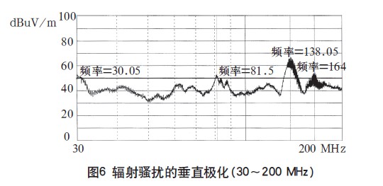 本開關(guān)電源一次通過了傳導(dǎo)騷擾的測試,測試波形如圖2、3所示。輻射騷擾高頻段230~1000MHz也測試合格,如圖5所示。只是在30~200MHz頻段范圍內(nèi)的垂直極化指標(biāo)超標(biāo),最大超標(biāo)20dB,如圖4所示。