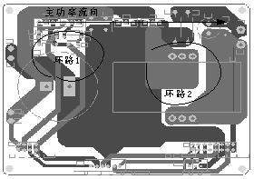 對于元器件的放置,由于開關(guān)電源的輻射干擾(E)與電流通路中電流(I)的大小,通路的環(huán)路面積(A),以及電流頻率(f)的平方等三者的乘積成正比,即E=I·A·f2。運(yùn)用這一關(guān)系的前提是通路尺寸遠(yuǎn)小于頻率的波長(此電路符合條件)。