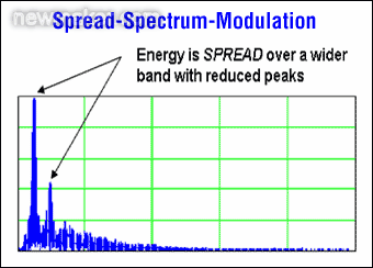 圖3:擴頻后的開關(guān)頻率及其諧波分布特性