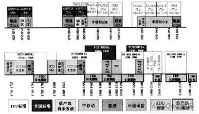 我國(guó)現(xiàn)有的無線與移動(dòng)通信頻譜具體分配情況如圖1所示,此外,WLAN使用無需許可的ISM頻段,UWB使用3.5/5.8G頻段,而WiMAX和RFID尚未最終確定頻段,其 中WiMAX有可能分配在2.5G、3.5G或5.8G頻段。