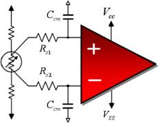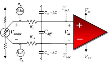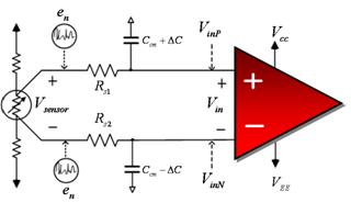 這種方法存在的問題是現(xiàn)貨電容都有一個 5% 到 10% 的典型容差,這就是說如果每條支線的 CCM 反向不匹配,總差動容差便會高達(dá) 20%。圖 3 更好地表示了這種電容不匹配,同時還顯示了電阻傳感器輸出端的共模噪聲輸入 (eN) 情況。