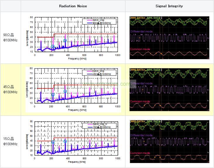 使用共模扼流線圈時(shí)的靜噪效果及信號(hào)波形評(píng)測(cè)圖5顯示的MHL信號(hào)線使用各種共模扼流線圈時(shí)的輻射噪聲/信號(hào)波形評(píng)測(cè)結(jié)果。共模扼流線圈在產(chǎn)生噪聲的30MHz~1GHz頻率段內(nèi),按照阻抗由高到低的順序,分別使用以下3種類型(90Ω、45Ω、15Ω@100MHz) (靜態(tài)特性請(qǐng)參考圖6) 來(lái)進(jìn)行測(cè)量。
