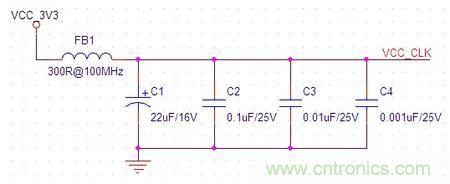 1、時鐘芯片的電源與其它電源用磁珠隔開,磁珠后加去耦電容,去耦電容由22uF的鉭電容和0.1uF、0.01uF、0.001uF的瓷片電容組成,這些電容可分別針對不同頻率的噪聲進(jìn)行濾波。