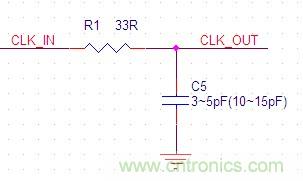 2、在時鐘信號線上,通常需進(jìn)行源端阻抗匹配,如33R的匹配電阻;同時,在匹配電阻之后,對于頻率高于66MHz的時鐘,加一個3~5pF的電容,對于頻率低于66MHz的時鐘,可加一個10~15pF的電容,形成RC濾波器,抑制500M以上的高頻輻射。其中,加大R和C可減小EMI輻射,但時鐘波形也會變差。