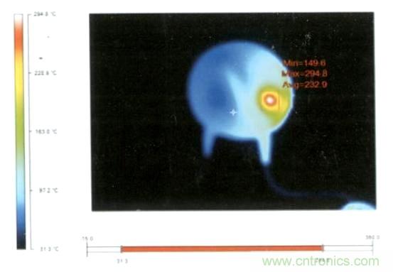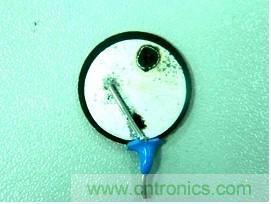這種壓敏電阻通過(guò)擊穿點(diǎn)進(jìn)行電流泄放,在泄流點(diǎn)會(huì)形成大量的熱量,這種熱量最終會(huì)導(dǎo)致壓敏電阻燒穿(見(jiàn)下圖)。