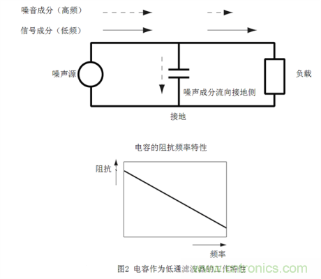 低通濾波器如果要利用該特性,就需要將電容插入噪聲通道與地線(xiàn)之間。如此一來(lái),低頻信號(hào)能夠照常通過(guò),高頻噪聲成分因接地側(cè)的阻抗較低,將流向接地側(cè),從而達(dá)到降噪效果。