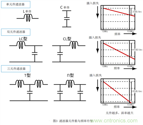圖 3顯示了組成濾波器的元件數(shù)與濾波器頻率特性之間的關(guān)系。想知道什么是插入損耗,可以看一下圖中各濾波器的信號(hào)衰減量,圖越往下衰減量越多。從圖上我們可 以看到,濾波器中的元件越多,頻率特性的斜率就越大。元件較少的濾波器的頻率特性范圍較窄(斜率較?。?,衰減頻率及通過(guò)頻率的選擇度較低,有可能導(dǎo)致部分 信號(hào)衰減或者噪聲沒(méi)有徹底去除。另一方面,元件較多的濾波器的頻率特性范圍較寬(斜率較大),頻率的選擇度較高,信號(hào)可以在幾乎不衰減的狀態(tài)下去除噪聲。