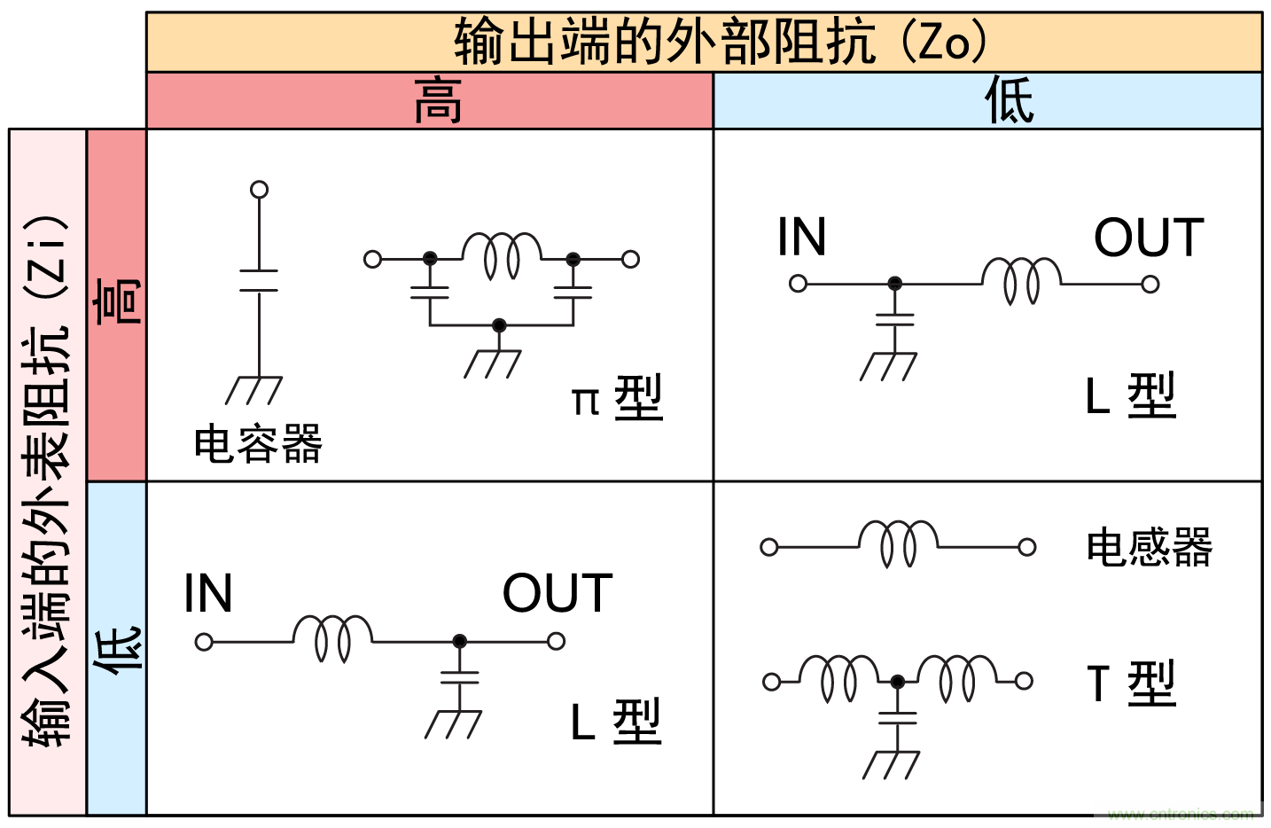 另 一方面,電感器具有所謂的用高阻抗使高頻噪聲反彈的作用,因此電感器與高阻抗部分相接則效果差,反之與低阻抗的電路相接則效果好?此原理歸納于圖2中?圖 中顯示了輸入端阻抗和輸出端阻抗的高低和該條件下噪聲除去效果好的濾波器結(jié)構(gòu)?從圖中可以看出,對(duì)于L型濾波器這類不具有對(duì)稱結(jié)構(gòu)的濾波器,若輸入輸出端 接反,則效果發(fā)生變化?使用時(shí)應(yīng)加以注意?