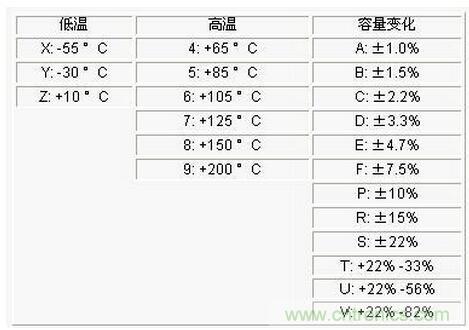 按極性分為:有極性電容和無極性電容。無極性電容(主要指陶瓷電容)的參數(shù)(電介質(zhì)材料類別,溫度特性以及誤差等參數(shù))選擇在一些設計中是比較關鍵的。表1為電容的溫度與容量誤差編碼表。如X7R電容表示電容工作的溫度范圍是-55-125℃,容量變化范圍是±15%。