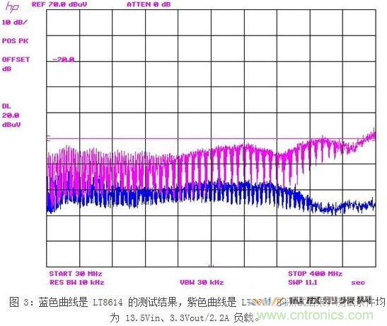 圖2所示測(cè)量結(jié)果是在電波暗室和以下條件下取得的:12Vin、3.3Vout/2A,固定開關(guān)頻率為700kHz