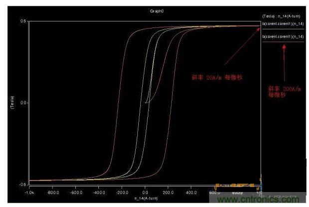 用三角波仿真了下磁芯,磁滯回線方正了很多,也不會因?yàn)檎乙?guī)律產(chǎn)生嚴(yán)重的拖尾效應(yīng)。圖2是同頻率不同幅度。圖3同斜率不同幅度的。