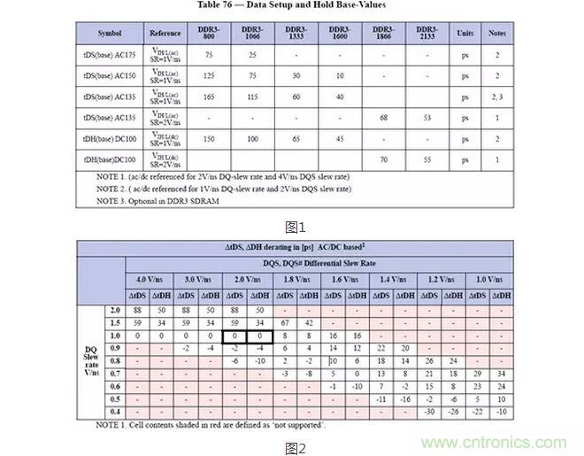 以DDR3信號為例,在JEDEC規(guī)范中規(guī)定了一個建立保持時間的基準值(圖1),還有就是derating值(圖2),兩者之和就是所需的建立保持時間。