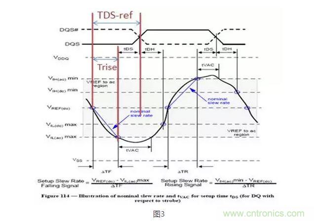 如圖3,建立時間等于TDS-ref(在ref處的建立時間)減去Trise(Vref到VIH AC的時間)。規(guī)范中的基準值是預減去了這個Trise的,這個預減去的值是特定slew rate為1V/ns時的值,若判斷門限是AC175,則預減去175ps。請再看圖2,當slew rate等于1V/ns時,derating為0,不需要調(diào)整;當slew rate大于1V/ns(更快)時,從Vref到Vih(ac)所需的時間就少,預減多了,要補回來,所以取值為正;當slew rate小于1V/ns(更慢)時就預減少了,所以取值為負。從圖2中的取值關系推導出取值公式為Derating @AC175 = 175ps - 175mV/SR,大家可以代入計算一下試試。如果判斷門限是AC150或其他都可以套用。而保持時間是DC門限,其公式為Derating @DC100 = 100ps - 100mV/SR。