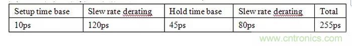 簡單,可以用上面的公式計算出derating值,但上述公式只適用于>1v/ns的情況。然后和基準值相加得到總的建立保持時間,如下表,總共所需的建立保持時間的總和是255ps。這樣就可以準確的估算時序裕量了。
