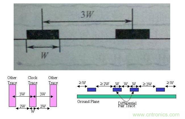3W原則是指多個高速信號線長距離走線的時候,其間距應(yīng)該遵循3W原則,例如時鐘線,差分線,視頻、音頻信號線,復(fù)位信號線及其他系統(tǒng)關(guān)鍵電路需要遵循3W原則,而并不是板上所有的布線都要強制符合3W原則。