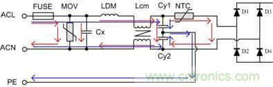 對ACL與ACN之間施加的浪涌電壓稱為差模浪涌電壓,差模路徑如圖中紅線所示;對ACL(或ACN)與PE之間施加的電壓稱為共模浪涌電壓,共模路徑如圖中藍(lán)線所示。