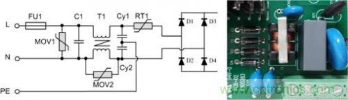 背景:以某型號的電源模塊為例,該模塊是周立功致遠(yuǎn)電子為某客戶定制的電源模塊,輸入85VAC~350VAC,且EMC前級電路電路嵌入到模塊中。抗浪涌要求差模電壓3KV,共模電壓6KV。更換更大的保險(xiǎn)絲后可承受6KV差模電壓。其前級原理圖及對應(yīng)實(shí)物圖如圖2所示