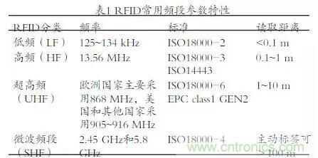 在應用方面,低頻和高頻的電子標簽,讀取距離較短、數(shù)據(jù)量少,因此適合用于近距離的識別。超高頻系統(tǒng)由于具有不同的電磁感應方式,讀寫器和標簽的讀取距離可>10 m,數(shù)據(jù)速率可達640 kbps。RIFD常用頻段參數(shù)特性,見表1。