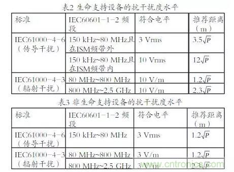 在IEC 60601-1-2《醫(yī)用電氣設備第1-2部分:安全通用要求并列標準:電磁兼容要求和試驗》中,規(guī)定了對生命支持設備和非生命支持設備的電磁抗擾度,他們的抗干擾水平分別為10 V/m和 3V/m 。生命支持設備主要指呼吸機、血透機等對維持患者生命起著關鍵作用的醫(yī)療設備,相較于非生命支持設備,這類設備的安全性能要求更為嚴格,抗電磁干擾水平也高于非生命支持設備。在IEC61000-4-3《電磁兼容性(EMC)第4-3部分:測試及測量技術—放射性、射頻式、電磁場抗干擾度試驗》針對所有電子電氣設備的電磁兼容標準中,醫(yī)療設備屬于其中的水平等級3和水平等級2。低頻率的干擾主要來源于傳導發(fā)射產(chǎn)生的干擾電壓;而高頻率的干擾主要來源于輻射發(fā)射產(chǎn)生的電磁干擾場強。同時在IEC60601-1-2標準中,也給出了在電磁環(huán)境中醫(yī)療設備抗干擾度的推薦距離,在相同的發(fā)射功率下,生命支持設備的抗電磁干擾水平要高于非生命支持設備,推薦距離也相對較遠,如表2~3所示。