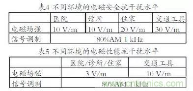 在過去關于醫(yī)療設備抗電磁干擾的標準中,往往僅考慮醫(yī)療設備在醫(yī)院內(nèi)的使用情況。但隨著科技的發(fā)展,許多設備逐漸變得輕巧、簡便,方便患者在各個地點使用,特別是一些便攜式、植入式及可穿戴的醫(yī)療設備。例如植入式的心臟起搏器,要保證在各種場所能正常安全地工作,不會被其他電子發(fā)射信號或設備干擾。因此IEC60601-1-4《醫(yī)用電氣設備第1-4部分:基本安全和必要性能的通用要求:電磁干擾的測試和要求》,提出了電磁環(huán)境的分類以及如何根據(jù)環(huán)境來合理地確定抗干擾水平。在這版標準中,強調(diào)了不同的電磁環(huán)境,分別是醫(yī)院、診所、住家、交通工具。不同環(huán)境中的醫(yī)療設備所需的抗干擾水平,見表4~5。