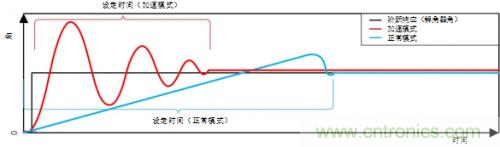 當(dāng)旋轉(zhuǎn)變壓器的電機位置或輸出信號變化迅速時,穩(wěn)定時間是RDC控制系統(tǒng)的快速性能指標(biāo)[2]。圖1顯示的一個是有階躍輸入變化(黑線)的RDC反饋控制系統(tǒng)的穩(wěn)定時間的例子。藍(lán)色信號顯示的是對電路的正常模式響應(yīng),紅色信號顯示的是加速模式過程中響應(yīng)(角快速變化)。為了在快速變化的條件下追蹤到旋轉(zhuǎn)角,加速模式幫助控制回路很容易跟蹤到一個快速的旋轉(zhuǎn)角[4]。