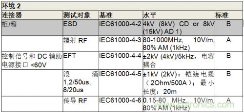 TI工程師測試IEC61800-3標(biāo)準(zhǔn)來獲取環(huán)境規(guī)范(表1)。該設(shè)計使用鎧裝連接器和鎧裝電纜(長度>30m)。標(biāo)準(zhǔn)的定義見表2。