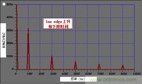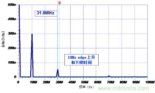 根據(jù)該公式,10nsEdge Rate對應(yīng)的諧波頻率大約為31.8MHz。圖3顯示:最后一個重要的諧波頻率為30MHZ。同時,1ns的Edge Rate對應(yīng)的諧波頻率318MHZ(圖2)。如果頻率范圍擴展到300MHZ以外,顯示的諧波仍很明顯,但卻在相關(guān)頻率上迅速變小。
