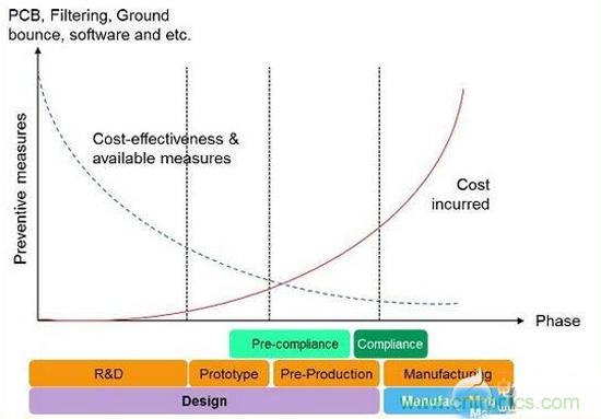 圖1:當產品在開發(fā)階段一步步推進時,變更所承擔的潛在成本上升,清除EMI問題的可用措施逐步受到限制。