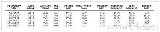 圖3是對應的列表數據報告,其中詳細列出了測試頻率、測量得到的幅度、校準后的校正因子以及調整后的場強。然后將調整后的場強與下一欄中的指標進行比較,確定余量或超額量,顯示在最右欄。