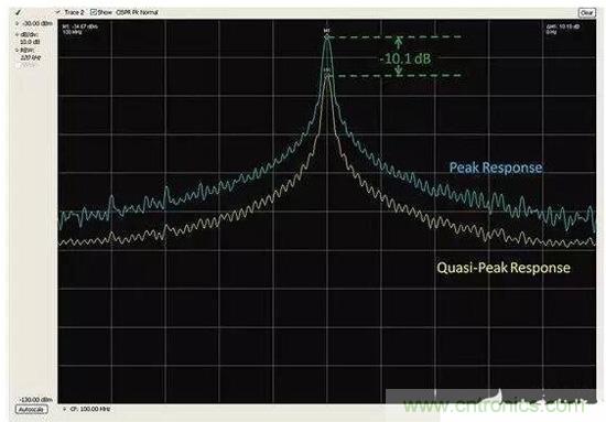 這里需要著重指出的是,對某些頻率范圍,CISPR測試要求提倡使用準峰值(QP)這種檢測器類型,這將掩蓋實際頻率。通常EMI部門或外部實驗室一開始 是使用簡單的峰值檢測器執(zhí)行掃描來發(fā)現問題區(qū)域的。但當所發(fā)現的信號超過或接近規(guī)定極限時,他們也執(zhí)行準峰值測量。準峰值是EMI測量標準定義的一種方法,用來檢測信號包絡的加權峰值。它根據信號的持續(xù)時間和重復率對信號進行加權,以便對從廣播角度看解釋為“騷擾”的信號施加更多的權重。與不頻發(fā)的脈沖相比,發(fā)生頻率更高的信號將導致更高的準峰值測量結果。換句話說,問題信號發(fā)生的越頻繁,問題信號的絕對幅度就越可能被準峰值測量所屏蔽。
