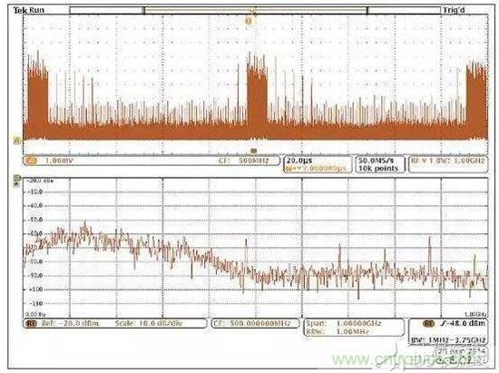 然而,混合域示波器(MDO)的推出使情況有了改觀,它能提供同步的而且與時間相關聯的觀察和測量功能。如圖5所示的這種儀器能夠相當容易地讓我們觀察哪個信號與哪個EMI事件同時發(fā)生,從而可以簡化EMI排查過程。