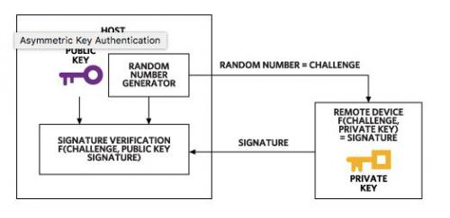 基于非對稱加密的安全認證依賴于兩個密鑰:私鑰和公鑰。只有被認證的設備知道私鑰,而公鑰可透露給希望對設備進行安全認證的任何一方。與上文中討論的方法一樣,主機向設備發(fā)送質(zhì)詢。設備根據(jù)質(zhì)詢和私鑰計算數(shù)字簽名,并將其發(fā)送給主機(圖2)。但此時,主機使用公鑰對數(shù)字簽名進行驗證。用于計算數(shù)字簽名的函數(shù)擁有特定數(shù)學屬性至關重要。非對稱方法中最常用的函數(shù)是RSA和ECDSA。同樣,設備也在不泄露密鑰情況下提交了自己知道密鑰的證明,即私鑰。