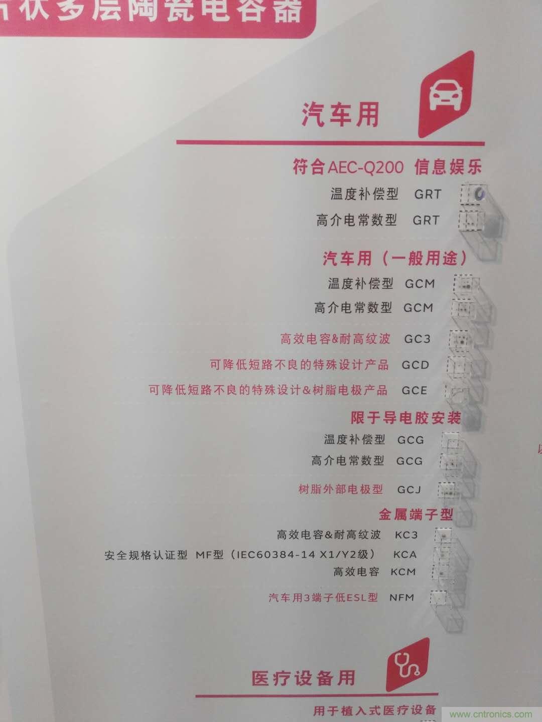 村田車載MLCC產(chǎn)品線可細(xì)分為符合AEC-Q200的信息娛用樂電容器、限于導(dǎo)電安裝電容器、金屬端子型電容器、汽車一般用途電容器,此外還有專門用在傳動(dòng)/安全(AEC-Q200)的電容以及最大溫度150℃的溫度補(bǔ)償型和高介質(zhì)常數(shù)型電容器。