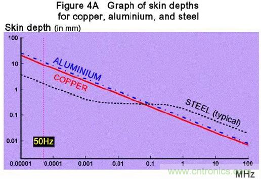 上圖:不同頻率下三種金屬的趨膚效應(yīng)深度(頻率越高,深度越淺,越趨膚);趨膚效應(yīng)以傳導(dǎo)的角度看,是希望趨膚深度深的,那表示導(dǎo)線的利用率高;但是對于屏蔽,是希望趨膚深度淺的,這樣就能以較薄的金屬屏蔽更多的電磁頻段;50Hz的趨膚深度5~15mm,很難屏蔽……