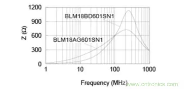 下圖顯示了曲線變化的示例。BLM18AG601SN1和BLM18BD601SN1都是片狀鐵氧體磁珠,在100 MHz時(shí)阻抗值為600Ω,但BLM18BD601SN1具有更尖銳的阻抗曲線,而B(niǎo)LM18AG601SN1的曲線上升更為平緩。