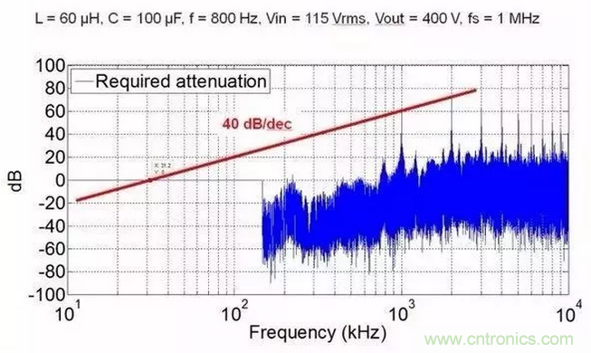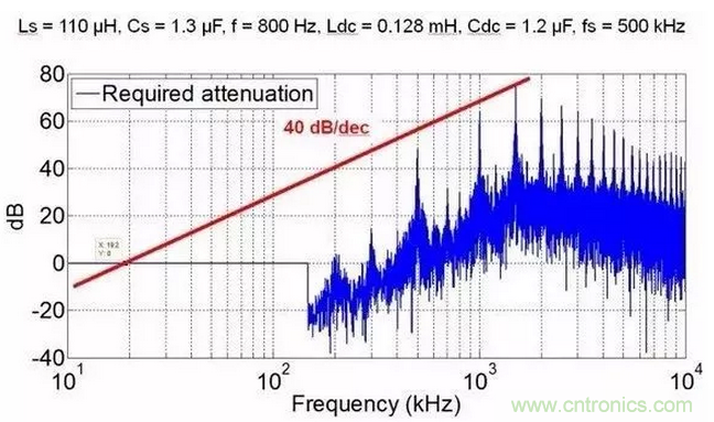我知道很多人會(huì)說,怎么可能,di/dt和dv/dt都大了,怎么可能EMI濾波體積還小了。我想說一句,共模和差模濾波器的沒有區(qū)別,相同的截止頻率下,高頻的衰減更大!就算你高頻下共模噪聲越大,但是你的記住,這個(gè)頻率下LC濾波器的衰減更大,想想幅頻曲線吧。為了說明這個(gè)結(jié)論,我給出一些定量分析結(jié)果。這些EMI分析均基于AC/DC三相整流,拓?fù)錇榫S也納整流。我分別給出了1Mhz和500Khz的共模噪聲,可以看出,500khz共模濾波器需要的截止頻率為19.2kHz,1MHz為31.2kHz。