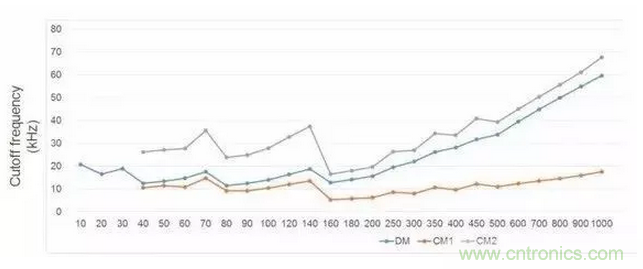 這張圖給出了不同頻率下共模和差模濾波器轉(zhuǎn)折頻率的關(guān)系,可以看出,一些低頻點(diǎn)EMI濾波器體現(xiàn)出了非常好的特性。例如70Khz,140Khz。而這兩個(gè)開關(guān)頻率是工業(yè)界常用的兩個(gè)開關(guān)頻率,非常討巧,因?yàn)镋MI噪聲測(cè)試是150KHz到30MHz。不過這個(gè)也與拓?fù)溆嘘P(guān)。