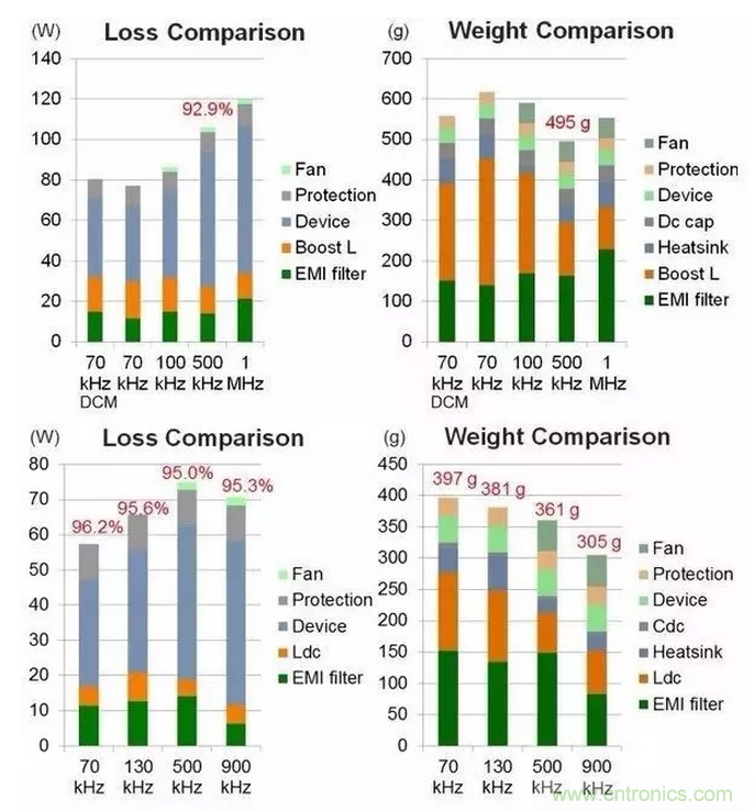 2、慎重選擇開關(guān)頻率,開關(guān)頻率會(huì)極大的影響整個(gè)變化器的功率密度,而且針對(duì)不同器件,拓?fù)?,最佳的開關(guān)頻率是變化的。