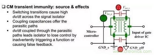 同時(shí)選隔離芯片的時(shí)候也需要注意一個(gè)參數(shù)叫做CM transient immunity(肯定會(huì)給的),這個(gè)參數(shù)最好大于開關(guān)瞬間,橋臂中點(diǎn)電平的變化速率。光耦隔離這個(gè)參數(shù)一般在30kV/us,磁耦在35kV/us,電容耦合在50kV/us(是不是絕望了,都比氮化鎵低,硅器件一般在10kV/us,Sic 30kV/us)。