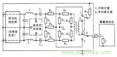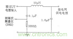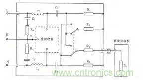 連續(xù)騷擾電壓測量主要測量EUT沿著電源線向電網(wǎng)發(fā)射的騷擾電壓,測量頻率為0.15~30MHz。測量一般在屏蔽室內(nèi)進行。測量時需要在電網(wǎng)和EUT之間插入一個人工電源網(wǎng)絡(luò)(LISN或AMN),其原理如圖15所示。AMN的作用是隔離電網(wǎng)和EUT,使測到的騷擾電壓