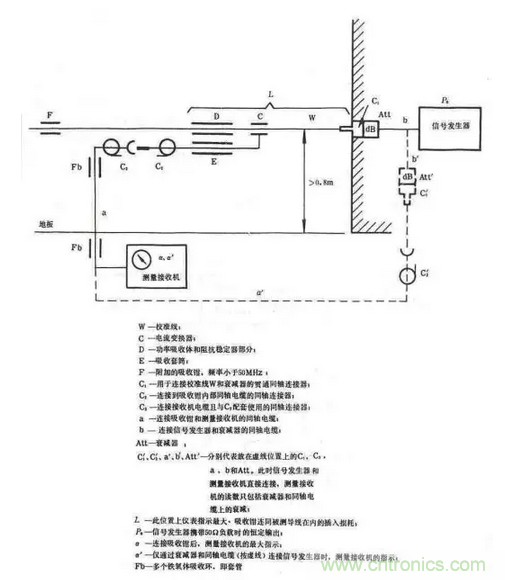 其中C是電流探頭,包括鐵氧體環(huán)和探測線圈,作用是測量電源線上的騷擾共模電流。D是鐵氧體環(huán)組,作為騷擾共模電流的穩(wěn)定負載,吸收騷擾功率,并用于隔離EUT和電網(wǎng)。如果在50MHz以下鐵氧體環(huán)組D不能充分起到射頻隔離作用,則應(yīng)在電網(wǎng)端再加一個輔助吸收鉗F,它也是由鐵氧體環(huán)組成。E也是鐵氧體環(huán)組,用于吸收外場在電流探頭引出電纜上產(chǎn)生的共模電流,以免影響測量結(jié)果。測量布置如圖19(b)所示,測試應(yīng)在屏蔽室內(nèi)進行,電源線長度應(yīng)大于6m,即大于30MHz的半波長加上吸收鉗的長度。對于每一個測試頻率點,吸收鉗都應(yīng)沿著電源線移動,找出最大值,因為共模電流在導(dǎo)線上是以駐波形式出現(xiàn)的。功率吸收鉗測量系統(tǒng)應(yīng)事前進行校準(zhǔn),得到修正因子—頻率曲線。校準(zhǔn)布置如圖20所示。