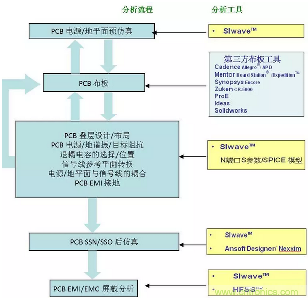 國內外眾多成功經(jīng)驗證明,電子產品的SI/PI,EMI/EMC仿真和高速通道性能仿真,需要進行兩方面的仿真——即電磁場仿真和電路仿真。電磁場仿真主要是研究結構對系統(tǒng)SI/PI ,EMI/EMC以及高速串行通道的影響,根據(jù)機構的物理特性(幾何結構和材料特性),通過電磁場計算,提取PCB、連接器、線纜等的寄生效應,生成S參數(shù)或Spice等效電路模型,或者直接得到結構的輻射特性和串擾特性,用于設計指導和性能改進。在電磁場仿真的同時,電路仿真也是必不可少的。一方面,電路仿真工具能夠將非線性器件和電磁場仿真得到的結構等效電路結合到一起,通過仿真得到信號的波形和頻譜,包括時鐘線、數(shù)據(jù)線和電源/地平面的波形、串行通道的眼圖和浴盆曲線等,直觀地考察系統(tǒng)的SI/PI和傳導EMI特性。 另一方面,對于輻射干擾來說,EMI輻射的強度不僅與結構相關(通過電磁場仿真進行研究),還與參與輻射的信號頻譜強度相關,頻譜強度必須通過電路仿真才能得到。