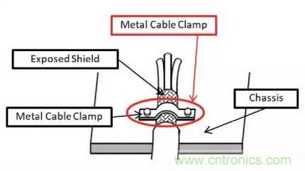 一個好的電磁干擾屏蔽是通過一個完整的360°外殼周圍的保護(hù)裝置來完成。完整的360°屏蔽是環(huán)繞整個受保護(hù)設(shè)備(例如電纜)并將其連接到底盤(見圖1)的環(huán)向終止端子上。